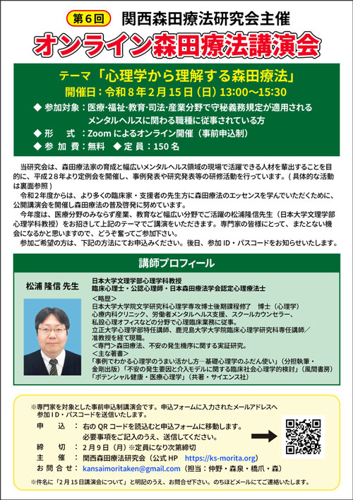今回、医療分野のみならず産業、教育など幅広い分野でご活躍の松浦隆信先生をお招きしてご講演いただく運びとなり、当講演へ参加を希望する専門家の方を募集しています。森田療法に興味のある専門家の方にはまたとない機会になるかと思いますので、是非ご参加下さい。参加料は無料です。 - 日時: