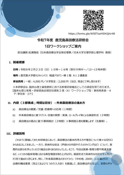 2/22 鹿児島森田療法研修会1日ワークショップのご案内 26/1/21