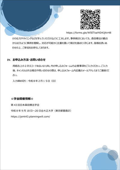 外来森田療法が主流になった今日、患者の日常の生活態度を把握するために、日記指導が行われています。講師の林先生ご自身が受けた入院森田療法の体験をもとに展開される日記療法について学ぶことができる、貴重な機会となっております。